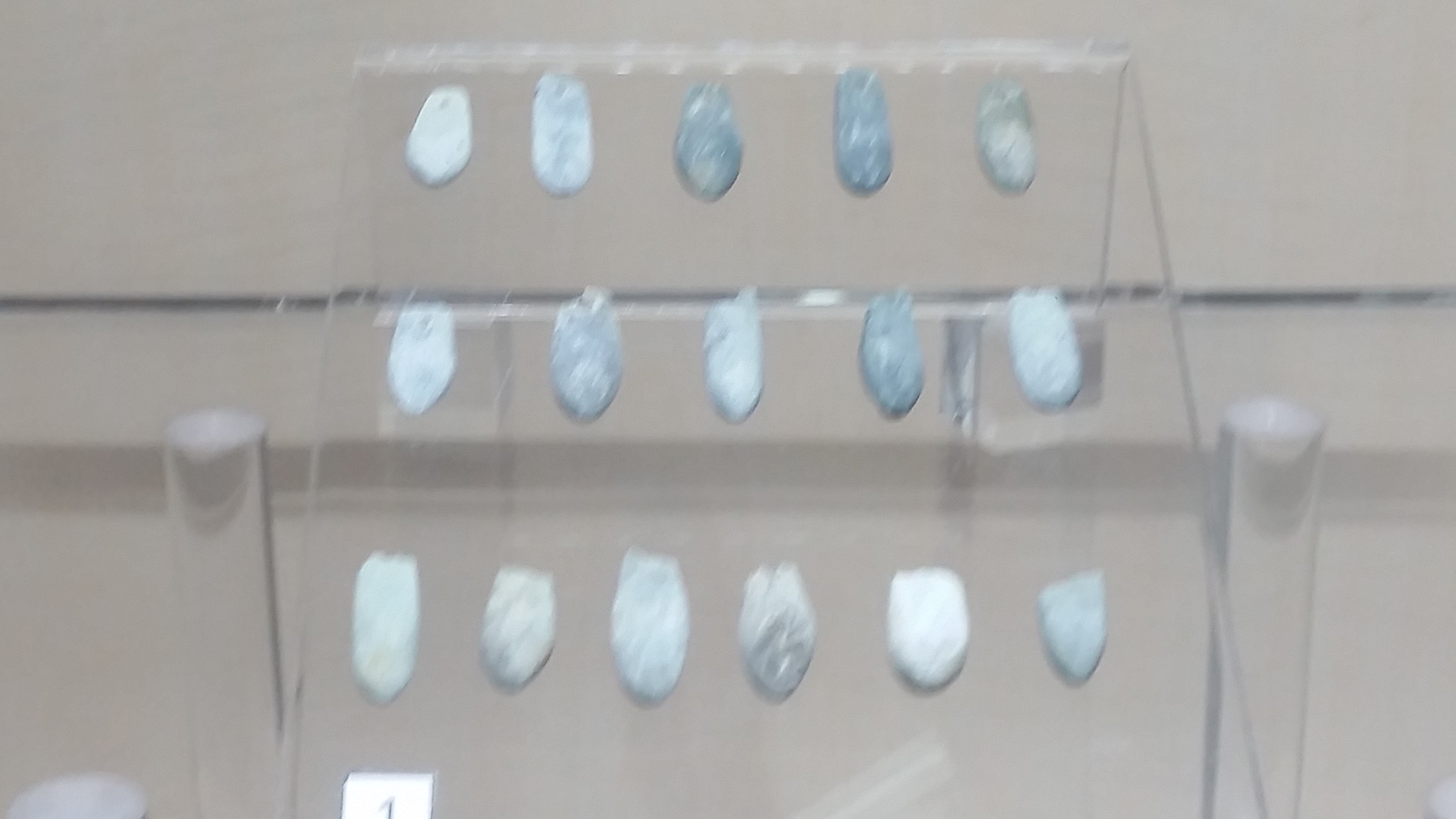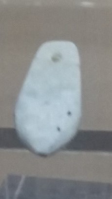 Bij de ontvangstbalie was daar geen informatie over, maar verderop stonden in een vitrine hangers uitgestald, die bij opgravingen in de gang van een hunebed (Monte Revincu, Noord Corsica) gevonden zijn. Ik had me al een tijdje afgevraagd wat deze hangers van steen met een gaatje erin (zie foto) te betekenen hadden. Nu ik ze in werkelijkheid zag, was dit voor mij het moment me erin te verdiepen.