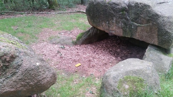Als ik vlakbij het hunebed sta voel ik de metafysische energie bij het hunebed. Met mijn handen voel ik de uitstraling van de staande stenen en op de grond voel ik de uitstraling van het centrale energiepunt dat zo belangrijk is bij het gebruik van het hunebed. Dit centrale energiepunt zit in het midden op de grond en wordt op de foto aangegeven door mijn lichtbruine telefoonhoesje (zie foto).