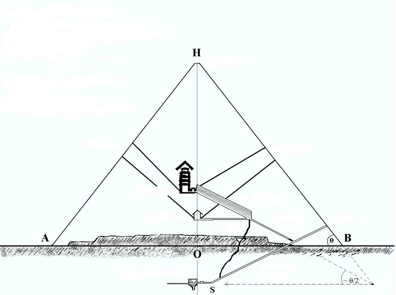 Figuur 9.1: Schematische doorsnede van de Grote Piramide met onderaan de ondergrondse kamer. (bron tekening: Metron Artiston)
