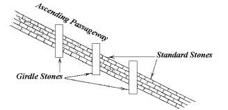In de dalende gang zijn opvallende zaken aan te wijzen. In 1872 ontdekten onderzoekers die de gang zorgvuldig aan het opmeten waren, dat het grootste deel van de gang is gemaakt van afzonderlijke stenen die zorgvuldig naast elkaar waren geplaatst, maar dat er drie grote dwarse stenen platen waren, waar de gang precies doorheen ging. Op deze punten vormden de dwarse stenen platen de muren, het plafond en de vloer van de doorgang. Ze werden ‘girdle stones’ genoemd, gordelstenen (zie figuur 14.2). Aan het benedeneind van de dalende gang zijn er ook nog 3 “halve gordels”. Iedere halve gordel bestaat uit twee stenen gecombineerd tot één ‘girdle stone’.
