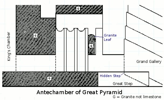 Maar waarvoor diende deze constructie? De Grote Piramide heeft een aantal aparte constructies die ieder op zich een uitdaging vormden voor de inwijdingskandidaat, maar deze constructie met valdeuren springt wel heel erg in het oog als van belang voor de inwijding. Temeer daar deze de toegang tot de Koningskamer verspert. De kamer die het eindpunt is van dit deel van de inwijdingstocht in de grote Piramide. Het verslag van de inwijdingstocht dat hierna volgt, verbindt deze Voorkamer met grote ingrijpende gebeurtenissen van de twintigste eeuw.