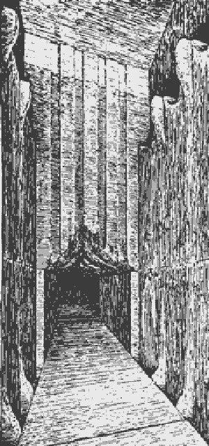 Hij gaat nu naar links in de deuropening en gaat onder de valdeur door naar binnen. Met een klap komt die valdeur achter hem weer omlaag.