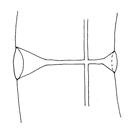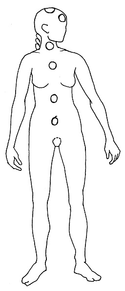During the exercises in this chapter we have been focussing on the front of the chakras, but there is more! The second up to the sixth chakra have an opening at the front that narrows toward the inside of your body and broadens again at the back (figure 4.4).