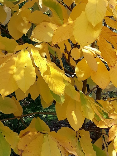 Het is een prachtige herfstdag vandaag met gaandeweg de dag meer zon. Veel bomen zijn nog redelijk groen met soms wat gele bladeren (zie foto boven) en een enkele boom of struik heeft felgekleurde bladeren (zie foto’s beneden).