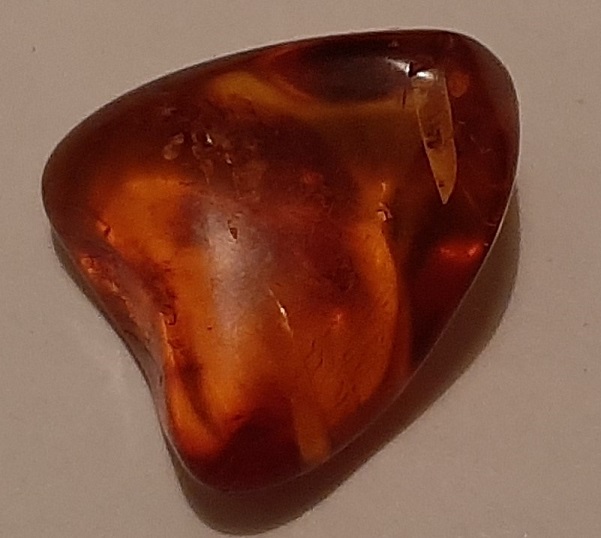 We hadden trouwens ook nog een kleine barnsteen (zie figuur 3) om mee te oefenen, zodat we goed het verschil konden voelen met het bergkristal. Barnsteen is versteende, fossiele hars van dennen en geen mineraal. Het is dus iets heel anders dan kwarts of seleniet. Het is ook brandbaar vandaar de naam barnsteen, wat oorspronkelijk is afgeleid van het Nedersaksische woord ‘börnen’ wat branden betekent.