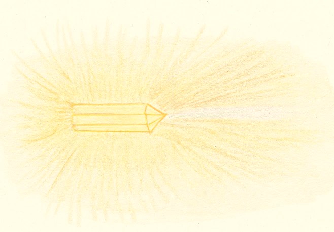 Bij de volgende oefening hadden we onze energie en aandacht eerst weer teruggetrokken uit het bergkristal en de barnsteen. We gingen ons nu richten op het uitstralingsveld van het kristal. In figuur 4 wordt een impressie gegeven van dit veld zoals dat zich helderziend aan mij liet zien. Opvallend is de sterke uitstraling bij de punt van het kristal. Met je handen kun je de subtiele uitstraling voelen en dat kan per persoon wat anders zijn. Je kunt bijvoorbeeld een tinteling voelen, een drukverschil of een warmte/koude verschil.