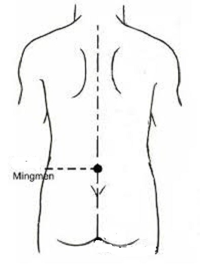 Zie of stel je een kanaaltje voor aan de achterkant van dit zonnecentrum naar je rug. Daar zit het ‘Ming men’ punt. In de acupunctuur bekend als de levenspoort.