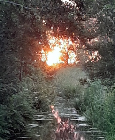 Ik vraag me tijdens de aura-reading af of er misschien nog  iets in de weg zit waardoor de energie van de zon niet optimaal in haar kan doorstromen. Ik zie om het bolvormig gebied een ring van angst-energie verschijnen omdat mijn readee niet verbrand wil worden. Mijn readee herkent dit: “Ik ben bang voor zonne-allergie, dat heb ik een paar jaar geleden gehad”. Daarna zie ik dat de angst-energie begint op te lossen en zeg haar: “Ik zie dat deze ring nu oplost, zodat er geen onnodige barrière meer is voor het opnemen van zonne-energie”. Readee: “Ik smeer me nu wel in, omdat ik bang ben om het weer te krijgen”. De zon begint weg te trekken achter de bomen (zie figuur 2) en we ronden de sessie af.
