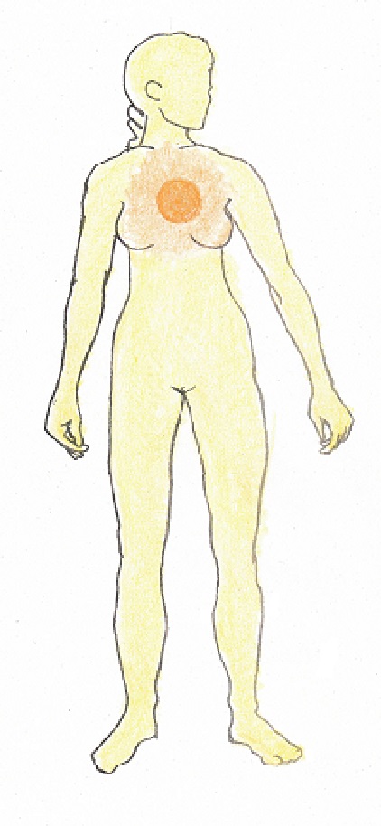 Ga lekker zitten op een gemakkelijke stoel met je voeten plat op de grond. Laat ‘wortels’ groeien vanaf je voeten en je stuit naar het bolvormige centrum van de aarde en maak ze daar vast. Je kan dan het gevoel krijgen steviger op je stoel te zitten. Zet je naam en de datum van vandaag in je wortels. Laat vervolgens aarde-energie binnen komen door je voeten en kosmische energie door je kruin. Meng beide energieën in je stuit en laat de gemengde energie door je heen stromen. Stel je een vlammetje voor op de rand van je aura, dat is op een armlengte afstand. Laat storingen uit je aura naar dat vlammetje gaan en op je uitademing knetterend daarin verbranden. Stel je een klein kamertje voor in het centrum van je hoofd. Zeg innerlijk ‘hallo’ in dat kamertje en als daar bezoek is of als er wolkjes hangen, stuur die vriendelijk maar dringend weg uit je hele energiesysteem. Zet je naam en de datum van vandaag in je kamertje zodat de energie ervan echt van jou is en in het ‘nu’ staat. Activeer tenslotte je hartchakra door je voor te stellen dat het straalt met een licht van liefde, vriendelijkheid, harmonie, hartelijkheid en mededogen (zie figuur 2).
