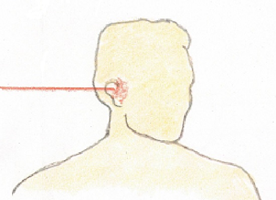 Richt die lichtbundel op de storing in je oorkamertje en zet tegelijkertijd die plek in het ‘nu’. Misschien zie je die plek veranderen en krijg je associaties en herinneringen waar die mee te maken heeft. Je kunt met je rechterhand, met je vingers die plek ook aanraken in je scherm. Misschien voel je een effect op je oor. Daarmee krijg je een nog duidelijker indruk van waar die plek in je oor te maken heeft.