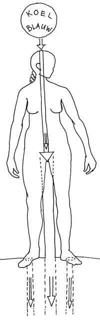 Laat het blauw daarna helemaal naar beneden doorgaan, door je benen en je voeten en koel ook daar de energie af. Je kunt je ook middenin onder je voeten kleine driehoekige kundalin-centra voorstellen. Koel die ook af. Laat tot slot het blauw door je grondingskoorden naar de aarde stromen. Naar het centrum van de aarde.