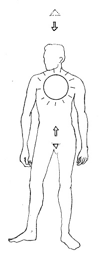 Laat de beide kundalini energieën via je hartchakra stromen en stel aan de voorkant ervan in je aura een prachtige gouden bol voor (zie figuur 9b). Die bol wordt door de beide kundalini-energieën zo opgeladen dat hij gaat stralen met een gouden licht. Deze gouden bol heeft een grote, transformerende kracht.