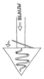 Laat de stroom blauwe energie verder omlaag naar je stuit stromen. Daar zit een driehoekig kundalinicentrum met de punt naar beneden. Hier zit een belangrijk centrum van je kundalinisysteem met een 3 ½ winding die rechtop staat. Aan de bovenkant zit een energiekanaal naar je kruin. Laat het blauw in en om de stuitdriehoek stromen zodat je kundalini-systeem daar diepgaand wordt afgekoeld. Zet dit gebied in het ‘nu’ en gebruik je hart-energie met het innerlijke licht om daar diepgaand storingen op te lossen. Voel hoe het daar rustig wordt. Stel je een klepje voor aan de bovenkant van je stuitdriehoek. Druk dit met de blauwe energie dicht waarbij het klepje over een nippeltje klikt zodat dit kundalinicentrum in zijn ruststand komt.