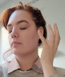Je kan de healing versterken door je handchakra’s te gebruiken en prana. Die prana kun je je voorstellen als piepkleine oranje energieballetjes om je heen. Ze kunnen een vitaliserende en genezende werking hebben op je energielichaam (en daarmee op je fysieke lichaam). Stel je voor dat je die oranje energie met die balletjes inademt en dat die dan oplost in je (energie)lichaam terwijl je 4 – 8 seconden je adem inhoudt. Herhaal dat tenminste twee keer zodat je helemaal opgeladen wordt met de prana-energie. Adem weer in en stel je voor dat de prana-energie door je armen naar je handen en je handchakra’s stroomt, waardoor die gaan stralen. Houd je handen vlakbij je oren, adem opnieuw prana in en laat de prana naar je handen stromen. Straal de energie van de prana met je handen naar je oren. Maak kleine bewegingen daarbij alsof je je oren liefdevol afstoft (zie figuur 4).