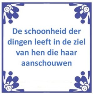 Dante suggereert dus met deze uitspraak dat het ervaren van schoonheid onze ziel activeert. Het lijkt een beetje op een uitspraak die ik tegenkwam op het internet van iemand die na de corona lockdown weer in haar geliefde museum kwam: “Ik houd van kunst om de schoonheid, maar het doet tegelijkertijd iets met de ziel”. De volgende tegeltjeswijsheid (figuur 1.5) vat de werking van schoonheid op de ziel nog eens mooi samen: