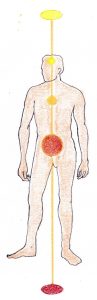 Stel je voor dat daar een bloem is, een prachtige bloem, een goud stralende bloem. Zeg daar ‘hallo’ tegen vanuit je hartcentrum. Als je nog een paar keer ‘hallo’ zegt kan die bloem nog meer gaan stralen en langzaam opstijgen in je langs de tantiënlijn.