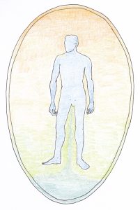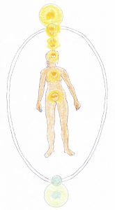 Het opstijgen van de Gouden Bloem door de tantiënlijn naar het Hogere Zelf (stralend zonnetje bovenin de aurawand) en resonantie met de godsvonk in de kernziel (rond gebied bovenop de aura). De ronde centra onderin de aura zijn de aardse polariteiten van respectievelijk het Hogere Zelf en de kernziel.