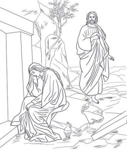 Maria Magdalena ontmoet Jezus bij het lege graf (Bron: Supercoloring.com)