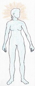Richt je nu op je voeten. Laat aarde-energie binnenkomen door je voetchakra’s, rondjes midden onder je voeten. Die rondjes kun je in gedachten open draaien waarna de aardenergie door je voeten en benen je lichaam instroomt. Dit versterkt je gronding, zodat je niet wegzweeft bij deze meditatie. Laat ook kosmische energie binnenkomen via je kruin. Deze kosmische energie komt van een zielengebied boven je aura (de kernziel). Zet eerst je naam op je kruin en de datum van vandaag. Laat daarna de sprankelende kosmische energie via je hoofd en rug doorstromen naar je stuit (zie figuur 4).