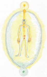 Laat ook de kosmische energie van boven toestromen. Zet eerst je naam en de datum op je kruin waar een energiecentrum zit, je kruinchakra. Op die manier komen er geen vreemde energieën binnen maar alleen jouw energie. Laat de kosmische energie doorstromen via je kruin, door je hoofd en je rug naar je stuitgebied. Meng daar dan de kosmische energie met de aardenergie (zie figuur 4).