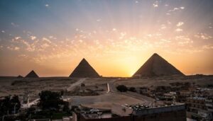 Figuur 11: Zonsondergang bij de Sfinx (Bron: https://www.pyramid-of-giza.com/nl/great-sphinx-of-giza/)