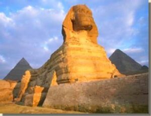 Nu kun je je op de Sfinx richten. Stel je de Sfinx voor in je beeld. Een menselijk gezicht met een hoofdtooi als van een farao, een koninklijke hoofdtooi. Het rust op het lichaam als van een leeuw, met achterpoten en grote voorpoten. Zeg in gedachten ‘hallo’ naar dit beeld, zo ga je gevoelscontact ermee maken. Geef dit beeld een gronding naar het centrum van de aarde. Dat stabiliseert dit innerlijke beeld in je meditatie. Je kunt je voorstellen dat de Sfinx een energie uitstraalt. Een heel hoge lichtende energie die als een lichtende waas om de Sfinx is. Stel je die lichtende waas ook voor. Zeg er in gedachten ‘hallo’ tegen vanuit je hart. Het kan zijn dat je een indruk krijgt van een reactie, die van de Sfinx-energie komt!