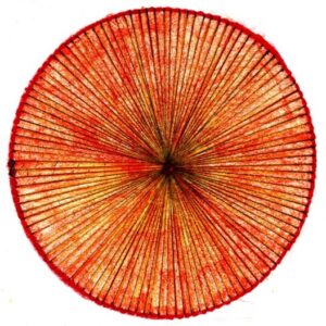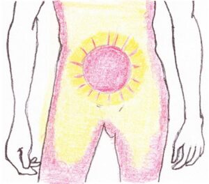 Richt je aandacht op je buik en visualiseer daar een grote oranje energiebol van 10 – 20 cm doorsnede. De omvang hangt af van de mate waarin dit centrum geactiveerd is. De contouren van deze bol hoeven er niet scherp uit te zien. Het kan ook als een zachte of zelfs wolkig aandoende wand zichtbaar worden of een bol met kleine uitstulpingen erop. Het centrum van deze bol zit enkele centimeters onder je navel, zo’n 10 cm buikinwaarts. Het kan helpen je hand op deze plaats op je buik te leggen. Op die manier kun je je beter richten op het gebied van je buik tan tiën.