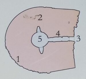 1: Muro de blocos de calcário; 2: Preenchimento com peças de calcário; 3: Entrada; 4: Corredor segmentado; 5: Sala central abobadada com paredes de ardósia e dois nichos laterais