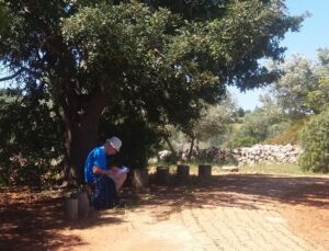Figura 4: Escrevendo a leitura da aura (aura-reading) sob a alfarrobeira em Tholos 9 de Alcalar
