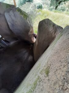 Caminhamos ao redor do dólmen, onde na parte de trás ainda resta parte do monte de cobertura (figura 3). Este monte era originalmente uma camada de terra com pedras que cobria o núcleo do dólmen feito de pedras verticais e lajes de cobertura. Neste monte havia uma abertura com um corredor levando à câmara central.