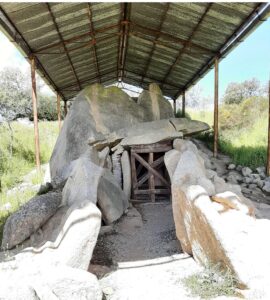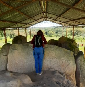 A vinte ou trinta metros de distância já é possível sentir sua irradiação energética metafísica. Isso significa que a construção energética deste dólmen ainda está ativa e podemos nos sintonizar com ela. O painel informativo no local indica que foi construído por volta de 3200 a.C., no período Neolítico. Em escavações foram encontrados instrumentos de pedra e machados polidos da primeira fase de uso do dólmen. A primeira coisa que vemos é um abrigo (figura 2) colocado para proteger o monumento da erosão.
