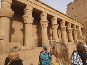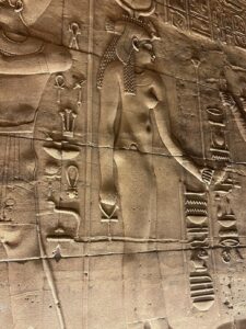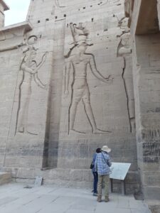 Lopend naar de Isistempel op Agilkia-eiland zie ik prachtige reliëfs van Isis/Hathor, Horus, Osiris en andere goden uit de oude Egyptische godsdienst in de tempelmuren. Door de toeristen op de voorgrond in figuur 2 wordt duidelijk hoe monumentaal de reliëfs zijn. Even voel ik de energie die van een paar afbeeldingen uitgaat als een lichte siddering aan de voorkant van mijn lichaam.