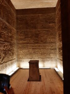Daar was de metafysische energie die ik kon waarnemen heel sterk, met de boodschap “Treed uit om het goddelijke te ontmoeten, daardoor geïnspireerd te raken en de problemen aan te pakken die er op dit moment zijn”. Naar mijn gevoel refereerde dit aan de spirituele praktijken van de toenmalige priesteressen. Daarbij trad onder gecontroleerde omstandigheden en met begeleiders in de buurt een priesteres uit haar fysieke lichaam om met geestelijke spirituele gidsen (hun goden) contact te maken. Zo konden zij bijzondere informatie krijgen en soms ook extra spirituele energie voor de aanpak van problemen die daar speelden. In het boek ‘Tussen leven en dood’ van Jozef Rulof, bekend trance medium halverwege de 20ste eeuw, beschrijft hij een vorig leven waarin dit aspect van uittreding naar voren komt. Naast het sanctum en ook verder in de tempel, zijn nog kleinere ruimtes aanwezig, ook geladen met energie. Om meer te weten te komen over het daadwerkelijk gebruik van deze tempel, stel ik me in op het geven van een aura-reading gericht op een concreet representatief voorbeeld.