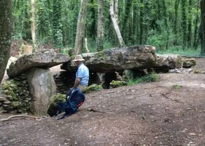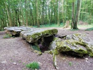 Ce fut toute une quête pour nous randonneurs (moi et ma copine randonneuse) de retrouver le dolmen de Dampsmesnil en Normandie, en France. Nous avons parcouru un long chemin grâce à « Google Maps », mais à la fin, tout n’est plus clair. Heureusement, nous avons rencontré un couple de français qui revenaient tout juste d’une visite au dolmen. Ils nous ont montré le chemin et ce fut une sacrée promenade. Nous avons finalement trouvé le dolmen dans une forêt au sommet d’une montagne. Il y avait un panneau d’information avec une photo d’un autre dolmen (déroutante) comme exemple de ce à quoi aurait ressemblé le dolmen de Dampsmesnil dans sa forme intacte vue de face (voir figure 4). Cet autre dolmen est situé dans le Val d’Oise, en France, et, j’ai découvert plus tard sur internet, des gravures (à peine visibles) ont également été trouvées dans des menhirs ici!
