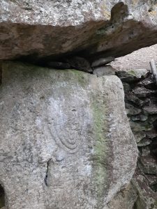 En arrivant au dolmen, j’ai presque immédiatement aperçu le relief sculpté à gauche d’une des pierres dressées à l’entrée (voir figure 5). J’ai bien vu les trois chaînes et aussi un sein en dessous. Ce n’était pas si clair car le relief y était quelque peu endommagé. En tout cas, il était clair que j’étais arrivé au bon dolmen.