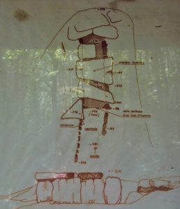 J’ai ensuite senti avec mes mains si les pierres étaient énergétiques et s’il y avait des points d’énergie dans ou autour du dolmen. La figure 6 montre une carte du dolmen montrant les différentes pierres et l’emplacement de l’image (sculpture) à l’avant gauche de l’entrée. Le dolmen a 6 mètres de profondeur à l’intérieur et la route d’accès fait 3 mètres de long selon le panneau d’information. Le dolmen est construit à partir de dalles de calcaire provenant de la région.